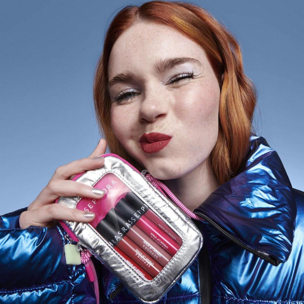 طقم الهدايا الأيقوني من مجموعة سيفورا، في شكل جديد احتفالي. تأتي مجموعة أحمر شفاه كريم ليب ستين الخاصة بالكريسماس في حقيبة فضية اللون. وهي حقيبة أنيقة يمكنكِ أخذها معكِِ في أي مكان بفضل الحبل المُدمج بها. يمكنكِ أيضًا إعادة استخدامها كحافظة لهاتفك أو للإكسسوارات الصغيرة.
